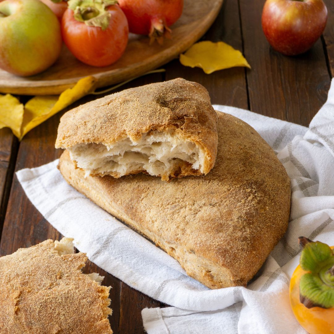 Un pane che racchiude i sapori della Sardegna: il nostro Civraxu incontra pomodori secchi e olive “obia pistada”, creando un gusto deciso, mediterraneo e ricco di profumi rustici.