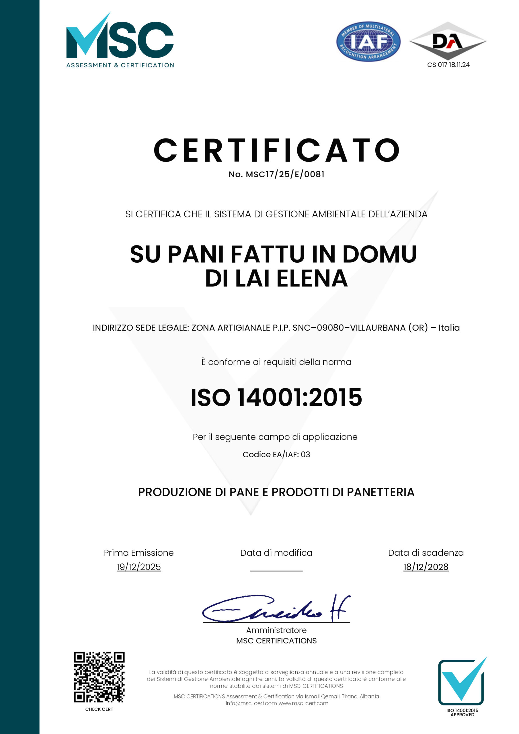 Il nostro panificio ha adottato un Sistema di Gestione Ambientale conforme alla norma UNI EN ISO 14001, per migliorare in modo continuo le prestazioni ambientali e ridurre l’impatto delle attività produttive.